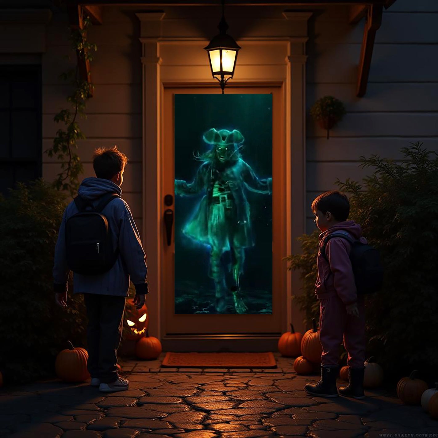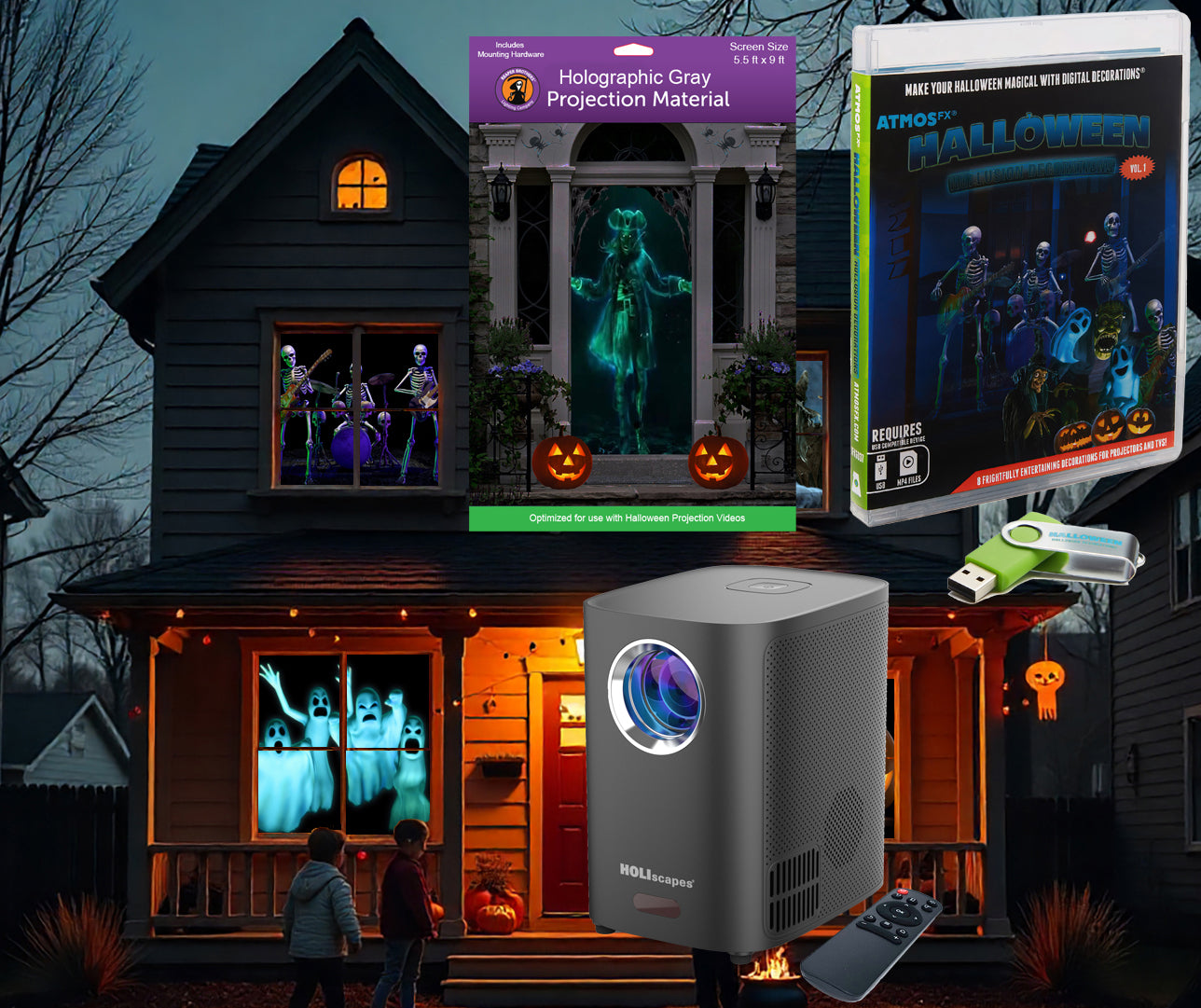 Halloween Hollusion Digital Decoration Kit Includes 8 AtmosFX Video Effects for Halloween + HD Projector + 5.5' x 9' Holographic Projection Screen
