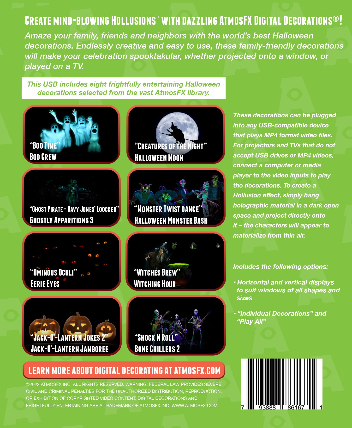 The Halloween Hollusion Digital Decoration Kit includes all of Following Items: 1280 x 720 mini LED projector with sound and remote; AtmosFX Halloween Special Effects Video on USB Stick - with 8 different scenes; Qty 1 - 5.5 ft x 9 ft Reaper Brothers holographic translucent rear projection Screen formatted for your Window or Door that creates a perfect 3D effect (includes mounting tabs); This Atmosfx video is a quick & easy way to decorate for Halloween. These video effects will turn any environment or surface into a thrilling and magical experience. The videos have continuous looping for unlimited run time which is perfect for any event.