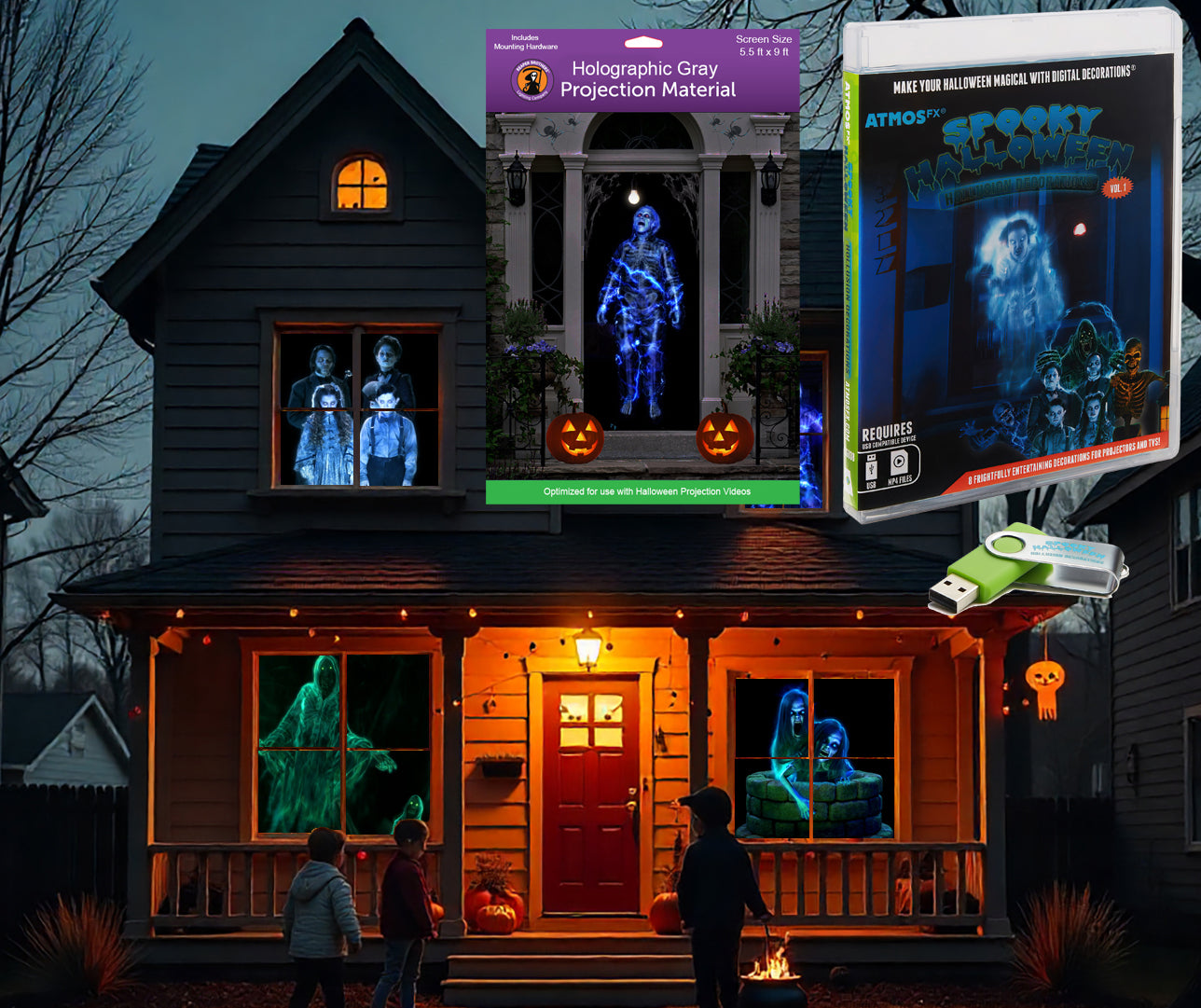 AtmosFX® Spooky Halloween Hollusion Digital Decoration Kit Includes 8 AtmosFX® Video Effects for Halloween Plus 5.5' x 9' Holographic Projection Screen
