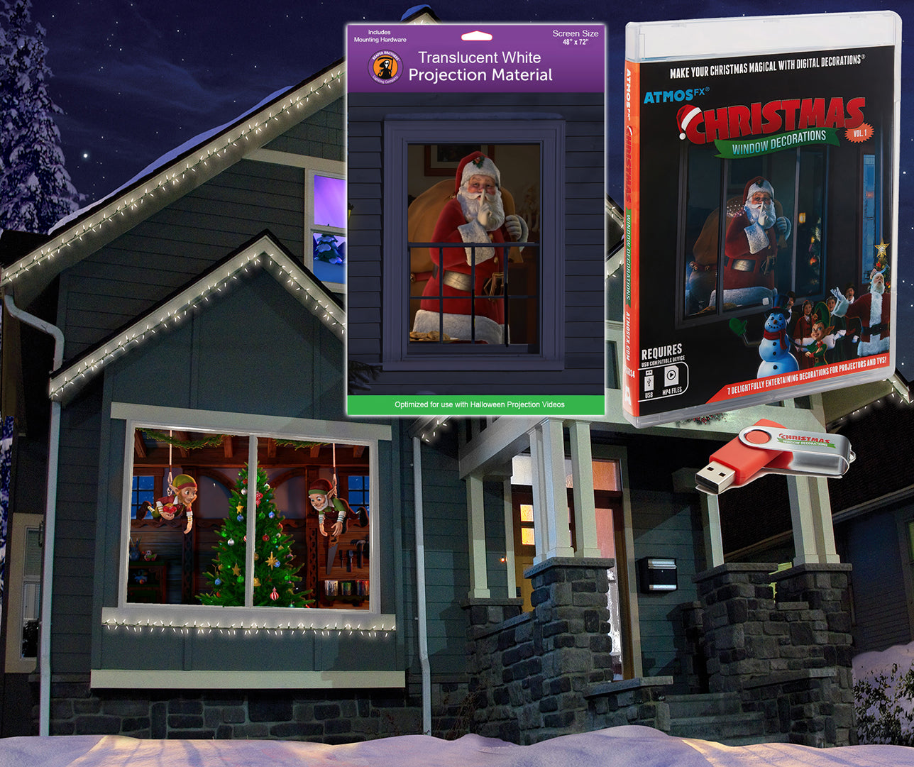 The Christmas Digital Decoration Kit includes all of Following Items: AtmosFX Christmas Special Effects Video on USB Stick - with 7 different scenes; Qty 1 - 48" x 72" Reaper Brothers translucent rear projection Screen formatted for your Window or Door that creates a perfect 3D effect (includes mounting tabs);