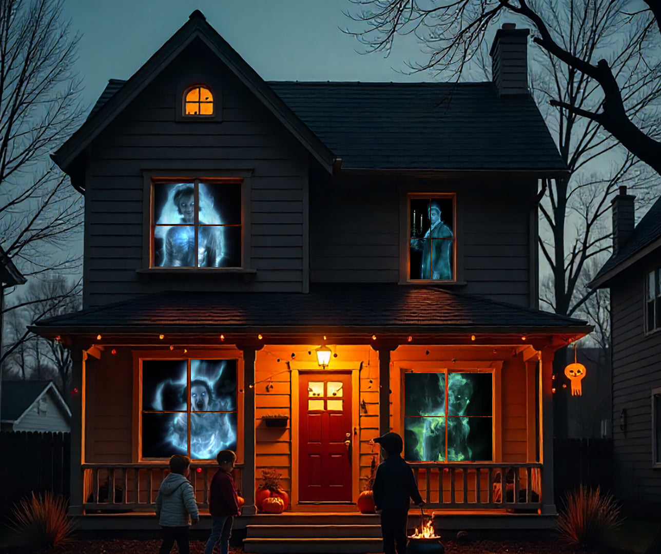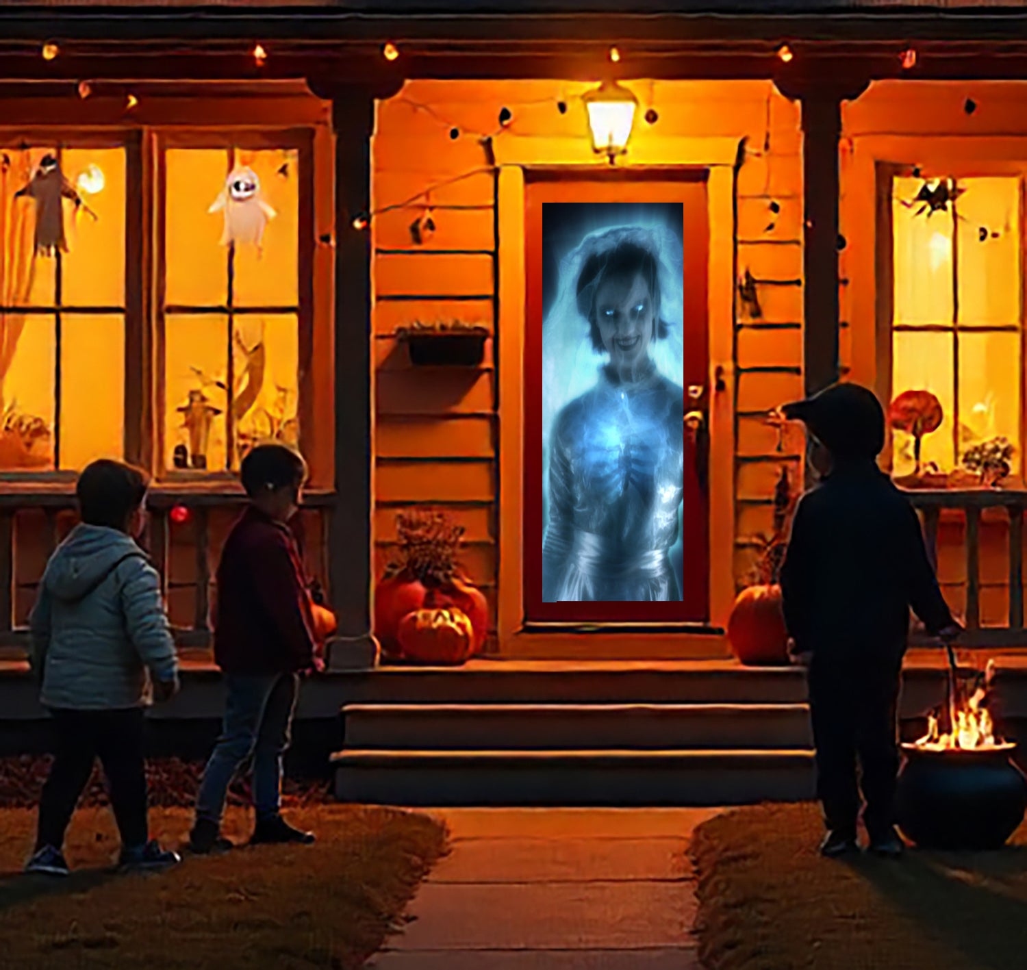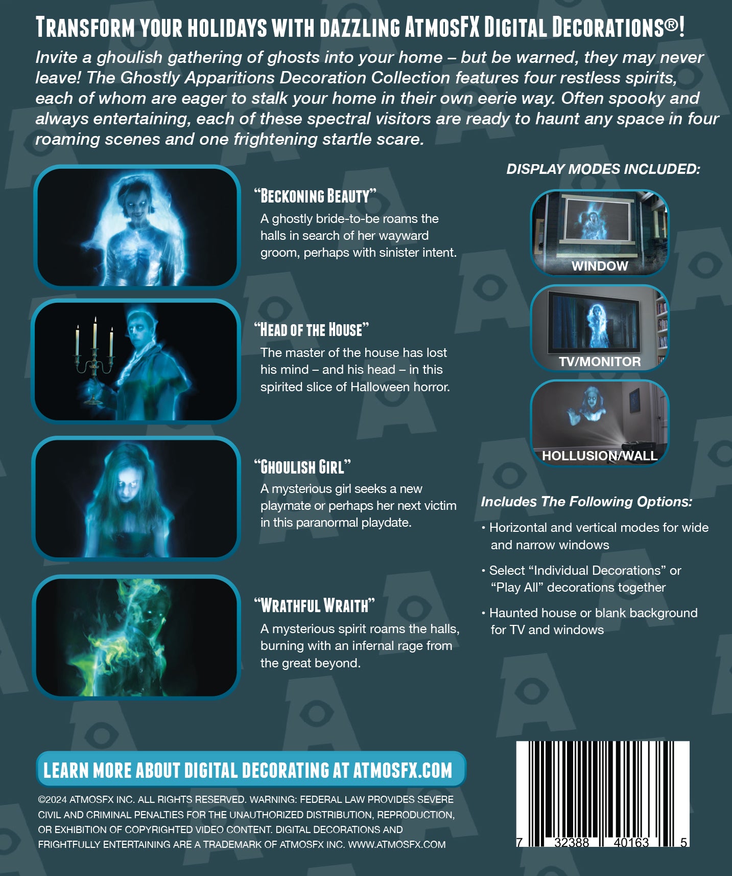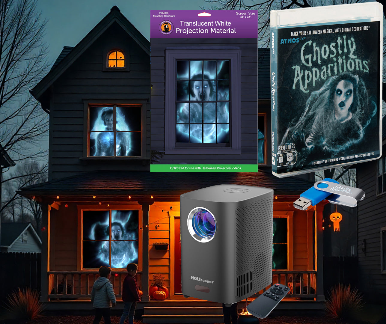 The Halloween Digital Decoration Kit includes all of following Items: 1280 x 720 mini LED projector with sound and remote; AtmosFX Halloween Special Effects Video on USB Stick - with 4 different scenes; Qty 1 - 48" x 72" Reaper Brothers translucent rear projection Screen formatted for your Window or Door that creates a perfect 3D effect (includes mounting tabs). Invite a ghoulish gathering of ghosts into your home – but be warned, they may never leave! The neighborhood gathering of trick-or-treaters may not leave either, once they see your Halloween display featuring the four restless spirits that make up the Ghostly Apparitions Decoration Collection. Often spooky and always entertaining, these spectral visitors will appear to walk through walls and hover in your home when displayed on windows and surfaces. TVs and tablets, too. And to create a truly unforgettable Halloween spectacle, project these strange spirits on Hollusion Projection Material to make it appear they are materializing out of thin air, indoors or out!