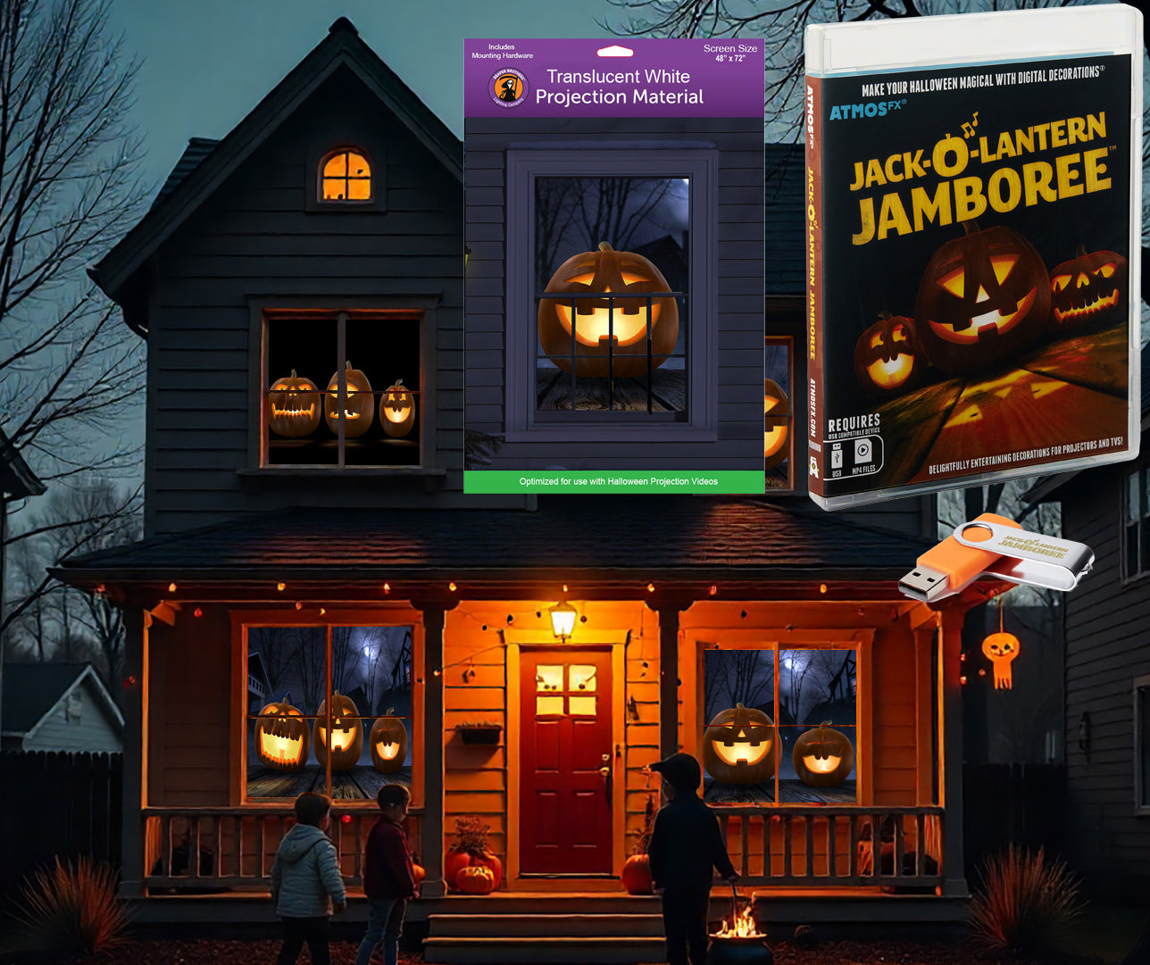 The Halloween Digital Decoration Kit includes all of following Items: AtmosFX Halloween Special Effects Video on USB Stick - with 4 different scenes; Qty 1 - 48" x 72" Reaper Brothers translucent rear projection Screen formatted for your Window or Door that creates a perfect 3D effect (includes mounting tabs). Welcome your trick-or-treaters with a high-spirited trio that joke, sing, and banter with each other. A guaranteed crowd-pleaser, the Jack-O'-Lantern Jamboree Decoration Collection inspires joy in the hearts of any Halloween fan, young or old. Project their glowing, mischievous faces on pumpkins real or fake to make them come to life. Or project the full pumpkin party on walls, windows, or play on TVs/Monitors to create the Halloween decoration display of your wildest imagination.