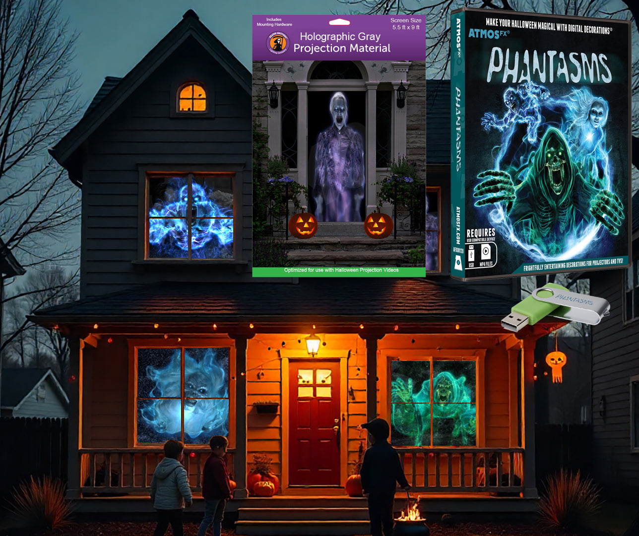 The Halloween Digital Decoration Kit includes all of following Items: AtmosFX Halloween Special Effects Video on USB Stick - with 5 different scenes; Qty 1 - 5.5 ft x 9 ft Reaper Brothers translucent rear projection Screen formatted for your Window or Door that creates a perfect 3D effect (includes mounting tabs). A ghastly gathering of ghouls, specters, and poltergeists has arrived from beyond the grave, materializing before the unbelieving eyes of those who visit your home. All four of the shocking spirits of Phantasms Decoration Collection are simply dying to levitate, shriek, and startle the mortals who dare to look upon them – ensuring your Halloween display becomes the hit of the neighborhood!