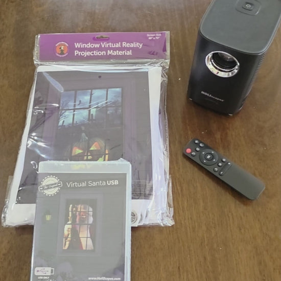 The Holiday Digital Decoration Kit includes all of Following Items: 1280 x 720 mini LED projector with sound and remote; Santa in Window Video on USB Stick; Qty 1 - 48" x 72" Reaper Brothers translucent rear projection Screen formatted for your Window or Door that creates a perfect 3D effect (includes mounting tabs)