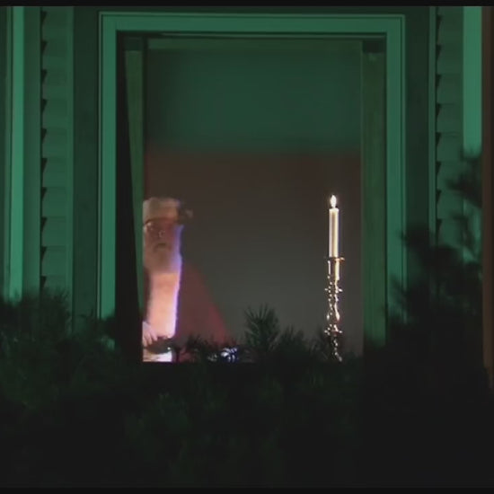 Santa in Window on USB. Set up is so easy! Simply hang our high resolution screen in your window, Insert the Santa USB in your projector (sold separately), plug in the projector, face projector 6-8 six feet from your window, focus, then watch from outside and you can see that Santa is inside the house delivering toys to those children "not naughty, but nice"!